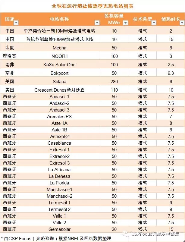 光熱電站儲(chǔ)熱類(lèi)型多種多樣,除主流的熔鹽儲(chǔ)熱外,其他方法還包括水工質(zhì)、混凝土、砂石儲(chǔ)熱等。下表為全球在運(yùn)行的熔鹽儲(chǔ)熱型光熱電站統(tǒng)計(jì):