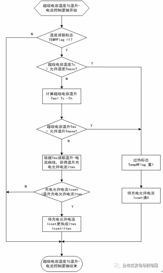 3)充電過程兼顧超級電容的溫度特性,采用超級電容溫升-電流曲線進行限制充電,同時監(jiān)視超級電容溫升過高和絕對溫度過高并停止充電,避免繼續(xù)充電導致溫度極限升高造成超級電容壽命快速減小或發(fā)生爆炸。