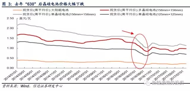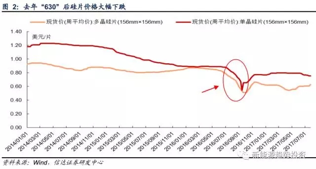 去年“630”后光伏產(chǎn)業(yè)鏈價格經(jīng)歷了斷崖式下跌,直到10月起才慢慢開始恢復。今年“630”后需求并未出現(xiàn)下跌,整個產(chǎn)業(yè)鏈各環(huán)節(jié)價格穩(wěn)定。主要原因是領(lǐng)跑者項目在第三季度仍有需求;分布式光伏補貼“630”后維持0.42元/度不下調(diào),下半年還會保持一定增量;以及海外需求旺盛。