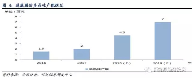 通威股份旗下四川永祥股份是國內(nèi)多晶硅料制造龍頭企業(yè)之一,目前高純晶硅產(chǎn)能達2萬噸/年。同時,公司于2017年6月啟動5萬噸高純晶硅及配套新能源項目,一期高純晶硅產(chǎn)能2.5萬噸/年計劃于2018年7月建成,項目全部建成后,永祥股份高純晶硅產(chǎn)能將達到7萬噸/年,躋身于全球行業(yè)第一集團。