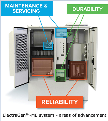 市場(chǎng)對(duì)于巴拉德ElectraGen™-ME備用電力系統(tǒng)的需求主要體現(xiàn)在兩個(gè)方面:(1)電網(wǎng)不可靠,可能隨時(shí)停電,需要備用電源做應(yīng)急處理,如在南非和印度尼西亞;(2)電網(wǎng)可靠,但是可能出現(xiàn)極端天氣或?yàn)?zāi)難造成電網(wǎng)臨時(shí)停電,如在加勒比海地區(qū)和日本。與前代產(chǎn)品相比,本次FC備用電源ElectraGen™-ME能在停電故障后更快地供電,反應(yīng)時(shí)間縮短了25%。巴拉德公司通過(guò)在系統(tǒng)部件上添加耐腐蝕材料、改善傳感器和氣體流道設(shè)計(jì)等方面的改進(jìn)提高了新型備用電源的壽命,其FC模塊壽命是先前的3倍。