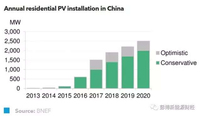 2017年,中國的戶用光伏新增裝機容量會超過1GW,超過2016年為止的累計裝機容量。BNEF預測,至2020年,中國的家庭屋頂光伏累計裝機容量將接近10GW,至2040年將超過100GW。