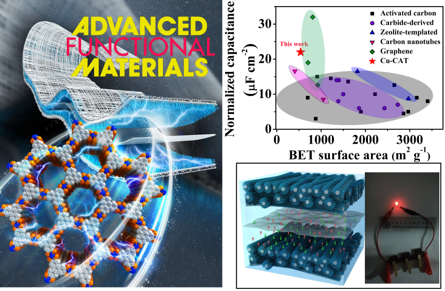 左:文章被選為《先進(jìn)功能材料》內(nèi)封面;右:基于導(dǎo)電MOF納米陣列的固態(tài)超級(jí)電容的性能及結(jié)構(gòu)圖。