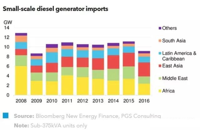 2016年,視在功率低于375kVA的柴油發(fā)電機(jī)在非洲和中東的銷量下降了25%,但可再生能源并沒有與其形成強(qiáng)烈的競爭,不足以解釋這種驟降。根據(jù)最近一期目前獲得的完整數(shù)據(jù)顯示,大品牌的可移動太陽能電池包市場在2016年下半年縮水8%。