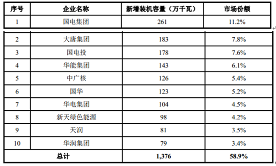 2016 年我國風電新增裝機排名前 10 的開發(fā)商及市場份額情況如下: