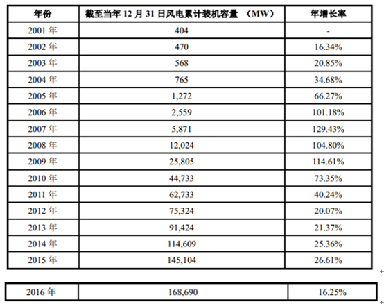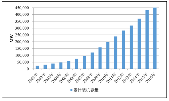 目前,我國已經(jīng)成為全球風力發(fā)電規(guī)模最大、增長最快的市場。根據(jù)全球風能理事會(Global Wind Energy Council)統(tǒng)計數(shù)據(jù),全球風電累計裝機容量從截至 2001 年 12 月 31 日的 23,900MW 增至截至 2016 年 12 月 31 日的 486,749MW,年復合增長率為 22.25%,而同期我國風電累計裝機容量的年復合增長率為49.53%,增長率位居全球第一; 2016 年,我國新增風電裝機容量 23,328MW(臨時數(shù)據(jù)),占當年全球新增裝機容量的 42.7%,位居全球第一。