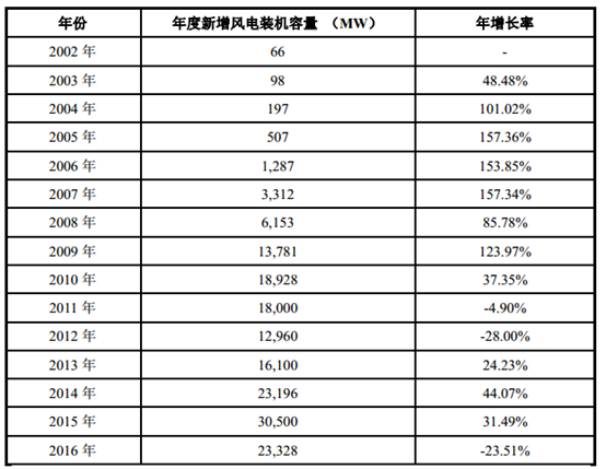 2002 年至 2016 年,我國風電年度新增裝機容量及增長率如下表所示: