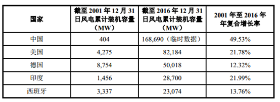 按照 2016 年底的風電累計裝機容量計算, 全球前五大風電市場依次為中國、美國、德國、印度和西班牙,在 2001 年至 2016 年間,上述 5 個國家風電累計裝機容量年均復合增長率如下表所示: