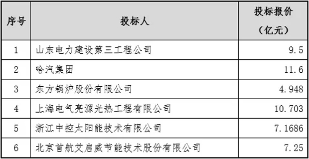 2017年2月18日,該項(xiàng)目聚光集熱系統(tǒng)開(kāi)標(biāo),開(kāi)標(biāo)結(jié)果如下表,從價(jià)格上分析,除東方鍋爐外,其余五家投標(biāo)方的平均投標(biāo)報(bào)價(jià)為9.244億元,而東方鍋爐的報(bào)價(jià)僅為4.948億元,比平均報(bào)價(jià)低了46.5%;即使包括東方鍋爐在內(nèi),六家投標(biāo)方的平均報(bào)價(jià)也達(dá)到了8.528億元,東方鍋爐的報(bào)價(jià)比均價(jià)低了42%。