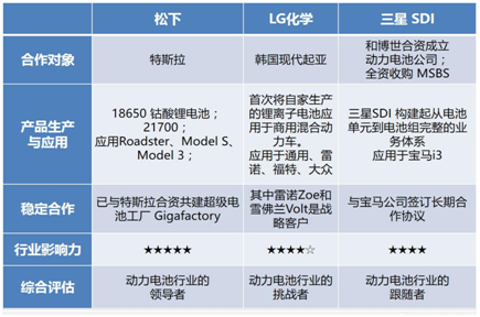 目前,動(dòng)力電池企業(yè)主要存在戰(zhàn)略客戶和合作客戶兩大類型,如松下與特斯拉,三星SDI與寶馬形成長(zhǎng)期穩(wěn)定的戰(zhàn)略合作伙伴關(guān)系,而LG化學(xué)因?yàn)楫a(chǎn)品品質(zhì)優(yōu)秀、產(chǎn)量充足、價(jià)格相對(duì)低廉而成為大多車企的合作伙伴。顯然,建立“整車-動(dòng)力電池”的整零關(guān)系舉足輕重。