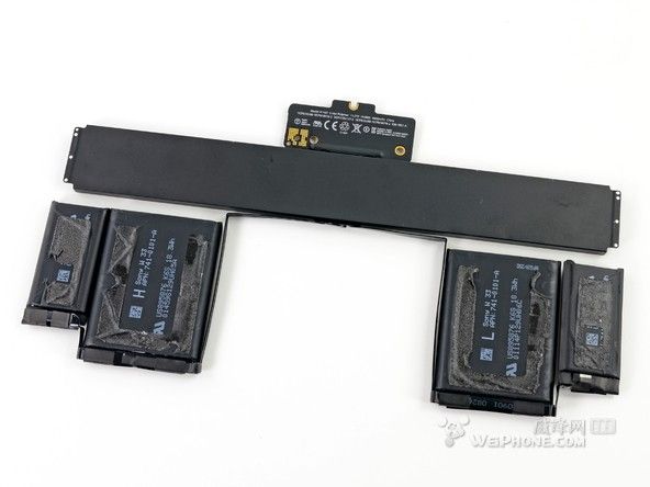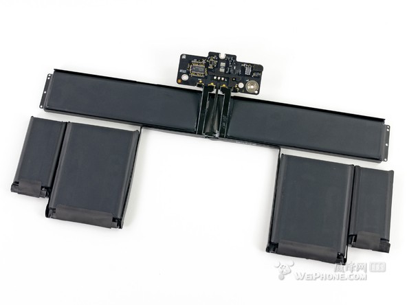 整塊電池一共由6個電池單元組成,整體看上去就像一個衣架。和 15 英寸 Retina Macbook Pro 的電池設(shè)計相比,“衣架”風格的設(shè)計為 13 英寸 Retina Macbook Pro 的內(nèi)部節(jié)省了許多空間。