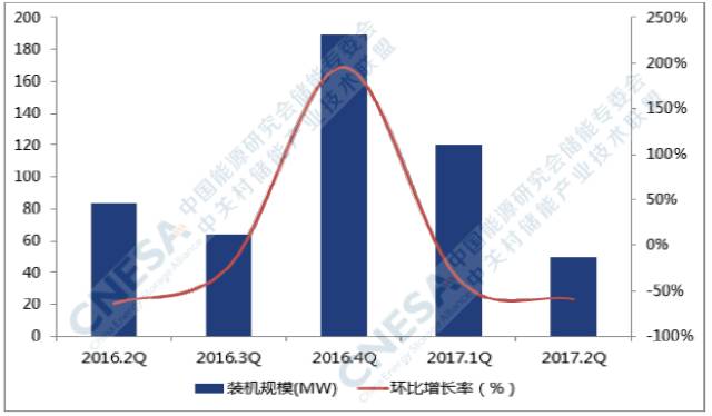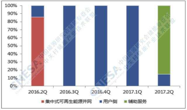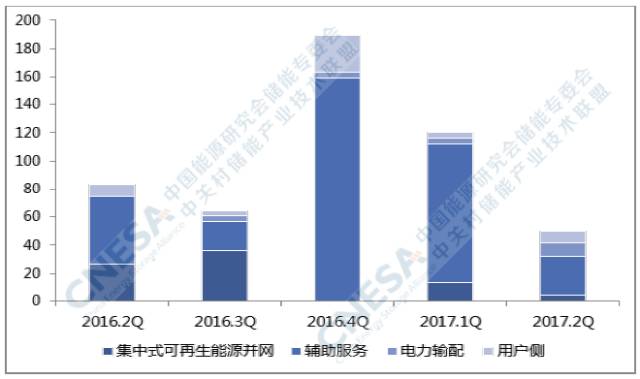 從應(yīng)用分布上看,全球新增投運(yùn)項(xiàng)目中,輔助服務(wù)領(lǐng)域的裝機(jī)規(guī)模最大,為28MW,所占比重為56%,同比下降42%,環(huán)比2017年一季度下降72%。