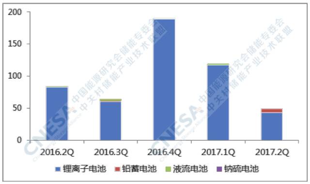 從技術(shù)分布上看,全球新增投運(yùn)項(xiàng)目中,主要以鋰離子電池和鉛蓄電池的應(yīng)用為主,且鋰離子電池的裝機(jī)規(guī)模最大,為43.2MW,所占比重為87%,同比下降35%,環(huán)比2017年一季度下降64%。