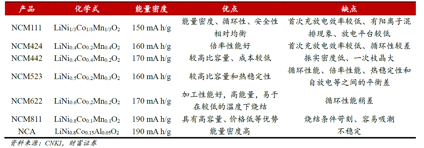 目前,三元正極材料市場(chǎng)以NCM523 為主,預(yù)計(jì)未來(lái)高鎳三元材料的比重會(huì)增加。NCM 材料一般包括NCM111、NCM424、NCM442、NCM523、NCM622、NCM811等。其中NCM111、NCM523、NCM622 和NCM811 較為常見(jiàn),目前國(guó)內(nèi)三元材料以NCM523為主,2016年其在三元材料分型號(hào)產(chǎn)量中占比為76%,NCM111 和NCM622 占比分別為13%和10%。未來(lái)隨著對(duì)動(dòng)力電池能量密度的高要求和續(xù)航里程的延長(zhǎng),高鎳的NCM622、NCM811以及NCA占比會(huì)持續(xù)增加。
