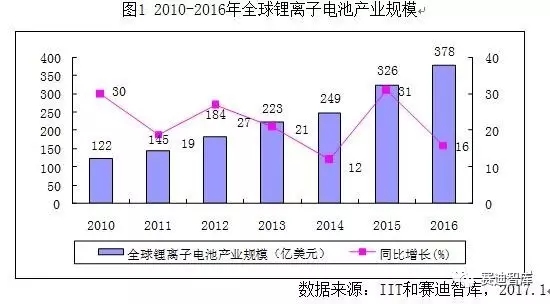 2016年,全球鋰離子電池產業(yè)規(guī)模預計達到378億美元,同比增長16%,增速較2015年下滑了15個百分點,原因主要在于全球電動汽車市場增速明顯下滑。
