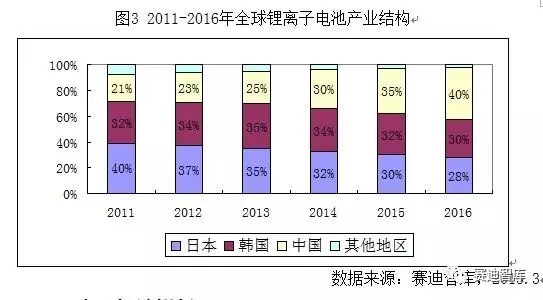 全球鋰離子電池產業(yè)主要集中在中、日、韓三國,三者占據(jù)了全球97%左右的市場份額。從2015年開始,在中國大力發(fā)展新能源汽車的帶動下,中國鋰離子電池產業(yè)規(guī)模開始迅猛增長,2015年已經超過韓國、日本躍居至全球首位,2016年領先優(yōu)勢繼續(xù)擴大。在新能源汽車帶動下日本鋰離子電池產量加快增長,韓國仍保持穩(wěn)步增長,但增速放緩導致其占比持續(xù)下滑。