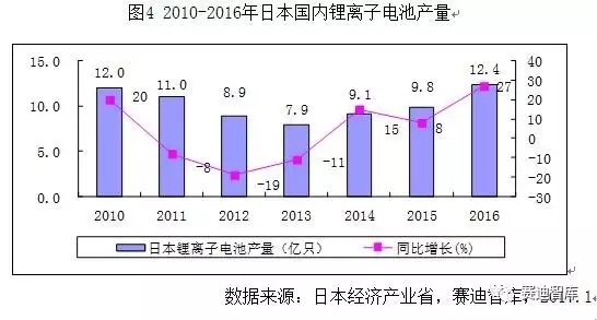 在全球電動汽車熱銷的帶動下,以松下、湯淺等為代表的日本鋰離子電池生產企業(yè)繼續(xù)向動力電池轉型,帶動日本鋰離子電池產業(yè)呈現(xiàn)加速增長勢頭。根據(jù)日本經濟產業(yè)省的統(tǒng)計數(shù)據(jù)顯示,2016年日本國內鋰離子電池產量達到12.4億只,創(chuàng)2010年以來的新高,同比2015年增長了27%。其中,動力型鋰離子電池產量占比已經接近2/3,創(chuàng)歷年來新高。從產值看,2016年日本國內鋰離子電池行業(yè)銷售產值達到3799億日元(約230億元人民幣),同比增長11%。