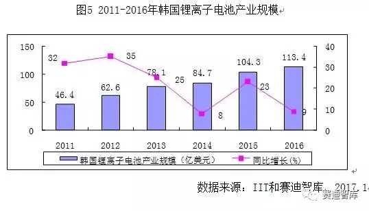 在經歷了2015年的快速增長之后,2016年韓國鋰離子電池產業(yè)保持穩(wěn)步增長,產業(yè)規(guī)模達到113.3億美元,同比增長9%,增速比2015年下滑14個百分點。主要原因在于兩方面:一是受Galaxy Note7“爆炸門”影響,三星SDI小型電池銷量出現(xiàn)顯著下滑,二是中國新能源汽車補貼政策調整,韓系動力電池產品未進入《汽車動力蓄電池行業(yè)規(guī)范條件》目錄,缺乏中國市場支撐,三星SDI和LG Chem的動力電池銷量增長速度明顯低于預期。
