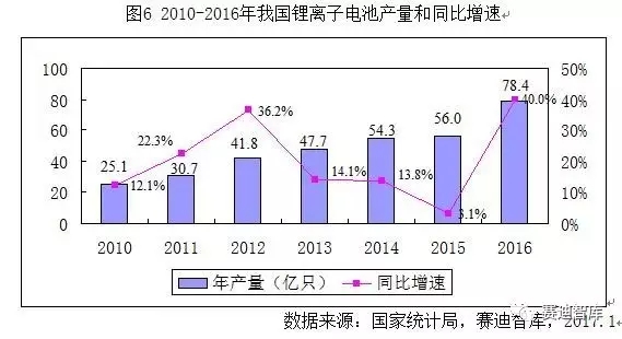 進入2016年后,在手機、電動汽車等主要應用產品產量快速增長的帶動下,我國鋰離子電池產量呈現(xiàn)高速增長態(tài)勢。國家統(tǒng)計局數(shù)據(jù)顯示,2016年我國鋰離子電池累計產量達到了78.4億只,同比增長40%,增速創(chuàng)下2010年以來的新高。
