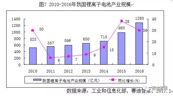 2016年我國鋰離子電池產業(yè)規(guī)模達到1280億元,首次突破1000億元大關,同比增長30%,繼續(xù)保持高速增長態(tài)勢。