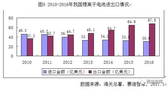 鋰離子電池出口持續(xù)增長,貿易順差進一步擴大。據(jù)海關總署數(shù)據(jù)顯示,2016年我國鋰離子電池出口14.9億只,出口金額67.8億美元,創(chuàng)歷年來新高,同比增長4.5%,增速降至2010年以來的新低;2016年我國鋰離子電池進口17.0億只,進口金額30.6億美元,同比下降7.3%,繼續(xù)保持下滑態(tài)勢。2016年實現(xiàn)貿易順差37.2億美元,比2015年的31.9億美元增長16.6%。