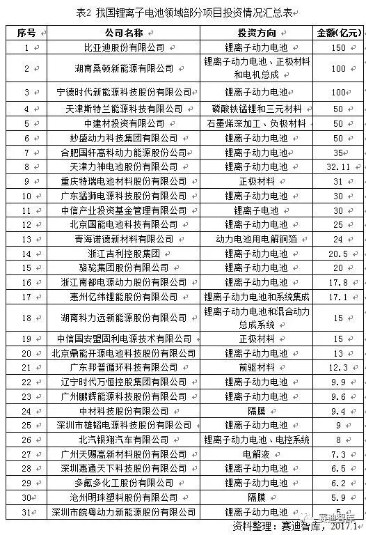 2015年開始我國電動汽車呈現(xiàn)井噴式增長勢頭,帶動了鋰離子動力電池市場需求猛增,2016年這一局面繼續(xù)持續(xù),加上“十三五”期間我國大力發(fā)展電動汽車的戰(zhàn)略決策,鋰離子電池產業(yè)投資力度在2016年不減,從上游關鍵原材料到下游電芯、模組,骨干企業(yè)加快擴產步伐,以期在動力電池領域搶占有利市場地位。據(jù)不完全統(tǒng)計,2016年國內鋰電產業(yè)投資(含擬投資)超過1200億元,實際投資550億元,其中動力電池、正極材料、隔膜投資額最多,表2所示為部分投資項目情況匯總表。其中,比亞迪、寧德新能源、國軒高科、天津力神等國內動力電池領軍企業(yè)投資額均在30億元以上。
