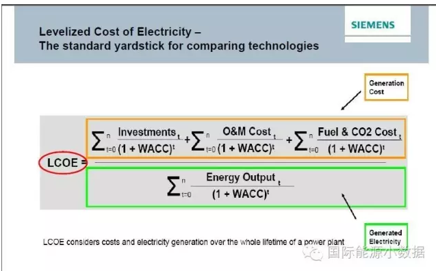 中國儲能網(wǎng)訊:計算某種電源全壽命期內(nèi)發(fā)電成本,可以用“電力供應(yīng)平準(zhǔn)化成本”(levelized cost of electricity,LCOE)的概念,即全壽命期內(nèi)的總成本(包括初始投資、運行維修、燃料、碳價)除以壽命期內(nèi)的發(fā)電總量: