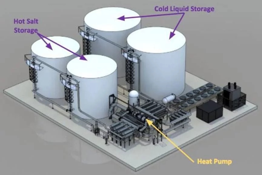 整個儲能設(shè)施主要包含兩個熔鹽罐、兩個冷卻液罐、一臺熱泵和一臺熱機(jī)。當(dāng)能量以電能的形式被輸入系統(tǒng)時,通過熱泵加熱將空氣分成熱空氣和冷空氣兩部分。熱空氣中的熱量被儲存在高溫的熔鹽中,而冷空氣被用來冷卻碳?xì)浠弦?作為"冷能"來儲存。