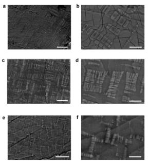 e,f在350oC處理以后淬火冷卻的樣品解離表面的形貌圖,超導小島完全分裂成細絲狀