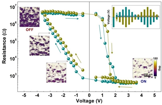 鐵電隧道結(jié)是一個金屬/超薄鐵電薄膜/金屬三明治結(jié)構(gòu),以幾個納米厚度的鐵電層作為電子隧穿勢壘,鐵電層中自發(fā)極化翻轉(zhuǎn)使得勢壘高度在高低兩個值中變化,而從在隧道結(jié)中獲得高、低兩個非揮發(fā)電阻態(tài)。鐵電隧道結(jié)具有非破壞性讀出、高存儲密度、超快數(shù)據(jù)訪問、低能耗等優(yōu)勢,因而被認(rèn)為有望突破傳統(tǒng)的非揮發(fā)存儲的瓶頸。鐵電隧穿阻變的電阻開關(guān)比越高,應(yīng)用前景越明朗,但是以往的工作得到的電阻開關(guān)比只有幾倍到幾百倍,限制了它的應(yīng)用前景。