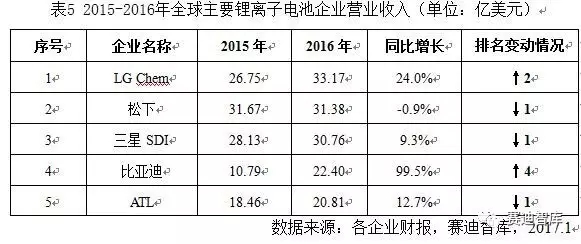 2016年全球鋰離子電池產(chǎn)業(yè)企業(yè)格局較2015年發(fā)生了明顯變化。LG Chem憑借24%的增速躍居至全球首位,首次超過(guò)松下、三星,主要原因在于其動(dòng)力電池被各大電動(dòng)汽車(chē)領(lǐng)域廣泛采用;松下下滑至第二,2016財(cái)年鋰離子電池業(yè)務(wù)收入較2015財(cái)年小幅下滑,主要在于消費(fèi)類(lèi)產(chǎn)品需求下降而動(dòng)力電池大客戶(hù)特斯拉增幅有限;三星SDI降至全球第三,受Note 7爆炸事件影響2016年增速出現(xiàn)了明顯下滑。比亞迪憑借將近100%的增速一舉超過(guò)包括ATL、索尼等在內(nèi)的企業(yè)躍升全球第四,ATL位居第五,兩者差距十分微小,但比亞迪和ATL與全球前三的差距較大。