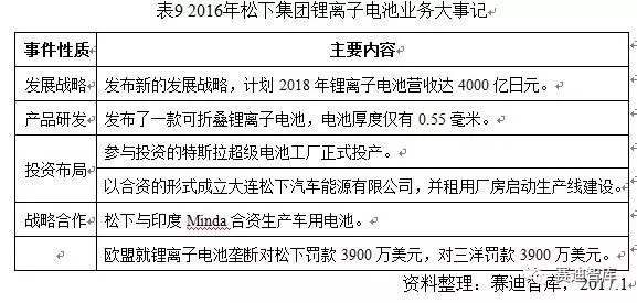 從20世紀(jì)末起,松下集團(tuán)就投身于鋰離子電池領(lǐng)域,在2009年并購(gòu)三洋電機(jī)后成為全球最大的鋰離子電池生產(chǎn)企業(yè),后被韓國(guó)三星SDI超越,2014年開(kāi)始在特斯拉的帶動(dòng)下,松下鋰離子電池業(yè)務(wù)收入開(kāi)始迅猛增長(zhǎng),2015年收入位居全球首位。2016年松下繼續(xù)加大動(dòng)力電池投入力度。截止至2016年3月31日,松下集團(tuán)在日本東京股票交易市場(chǎng)的收盤(pán)價(jià)為1033.5日元/股,其市值為2.54萬(wàn)億日元,較2015年同期下滑了30%。