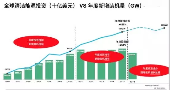 彭博新能源財(cái)經(jīng)分析師劉雨菁在索比光伏網(wǎng)西安舉辦的“光伏創(chuàng)新領(lǐng)跑技術(shù)論壇”上發(fā)布了自己預(yù)測:2017年以后,光伏電站新增裝機(jī)增長將放緩,甚至隨著新能源發(fā)電成本下降,投資額下降,這可能是十余年來首次。