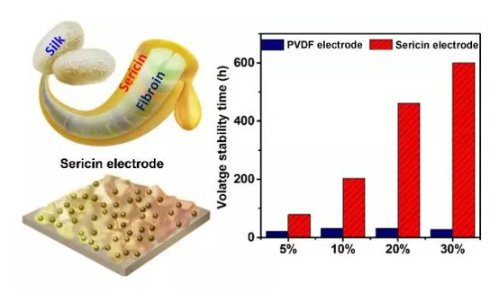 不僅如此,組成絲膠蛋白的多肽鏈含有豐富的親水基團,能夠有效與材料顆粒表面附著,從而保證電極材料的結(jié)構(gòu)整體性。尤為重要的是,絲膠蛋白是提取自蠶絲的工業(yè)廢料,原料豐富,每年產(chǎn)量超過5萬噸,生產(chǎn)成本低廉且工藝簡單,可以變廢為寶,為其在大規(guī)模的工業(yè)應(yīng)用提供了可能。