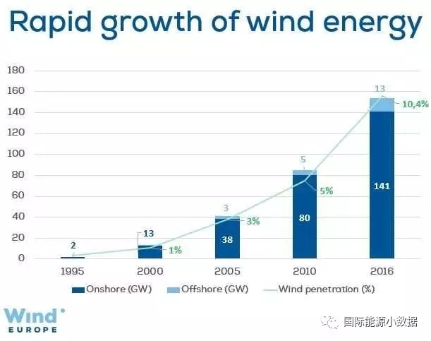 中國儲能網(wǎng)訊:根據(jù)Wind Europe的數(shù)據(jù),過去20年來風電在歐洲(歐盟28國)迅速發(fā)展。到2016年底,歐洲國家風電裝機已經(jīng)達到154吉瓦,其中13吉瓦為海上風電;2016年風電占發(fā)電量的比例達到10.4%。