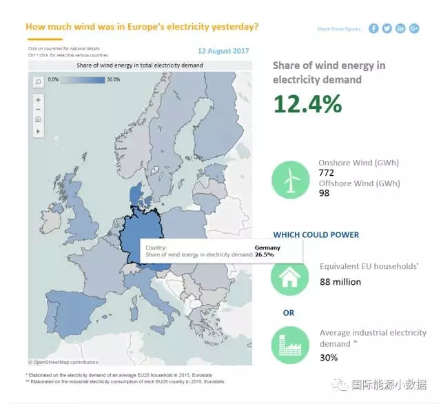 Wind Europe還跟蹤監(jiān)測歐盟28國每天的風電發(fā)電情況。2017年8月12日這一天,歐洲風電占比12.4%,其中德國風電占比26.5%。
