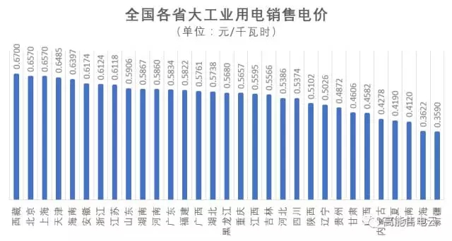東部大工業(yè)用電銷售電價整體高于西部,西藏大工業(yè)用電銷售電價最高,為0.67元/千瓦時;新疆大工業(yè)用電銷售電價最低,為0.3590元/千瓦時。