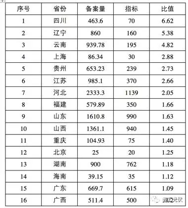 表1:各省風(fēng)電的備案量、指標(biāo)與比值