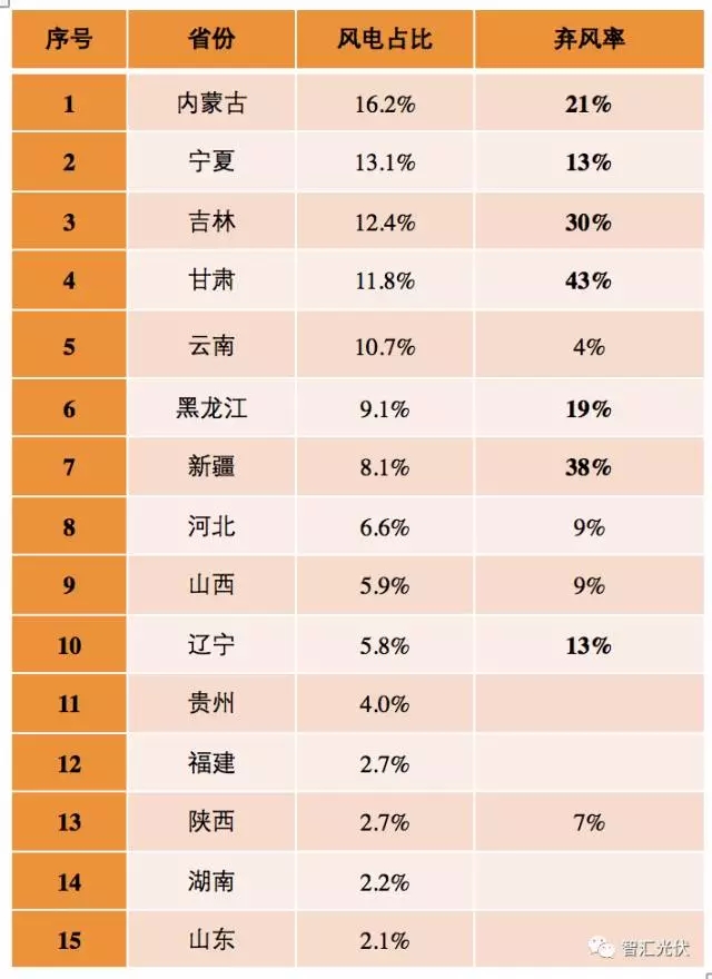從上表可以發(fā)現(xiàn):風(fēng)電占比在5.8%以上的省份,都有明顯的棄風(fēng)。
