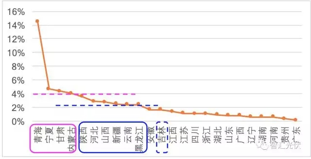 則,按照“十三五”規(guī)模指標(biāo)數(shù)據(jù),各省到2020年時,風(fēng)電、光伏發(fā)電量占各省用電量的比例如下圖。