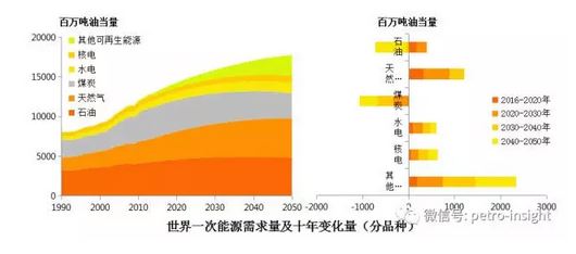 世界一次能源需求在2050年達到175億噸油當量,增長約27%,期間年均增長0.65%; 2016~2030年為0.95%,2031~2050年為0.45%,增速逐漸放緩。展望期內可再生能源年均增長6%,天然氣年均增長1.3%,石油年均增長0.3%,煤炭年均下降0.8%。