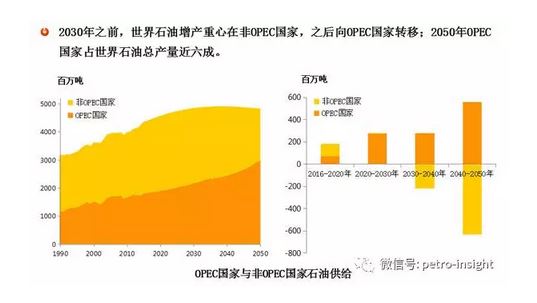 3.世界石油需求增速逐步放緩,2050年達到48.2億噸,需求增量全部來自非OECD國家;OPEC國家是展望后半期供應增量的主要提供者。