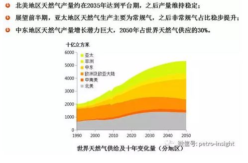 2030年后,歐洲及歐亞大陸天然氣需求有小幅下降,緣于可再生能源的快速發(fā)展;其他地區(qū)天然氣需求均保持快速增長。中東和亞太是未來全球天然氣產量主要增長來源。