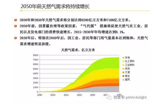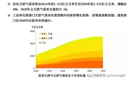 4.天然氣需求在展望期內穩(wěn)步增長,且2040年前為高速增長期,需求增長主要在電力、工業(yè)和居民等部門。