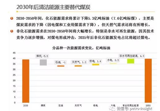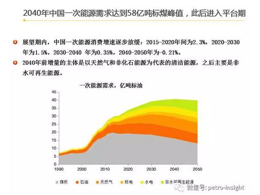 1.一次能源需求將于2040年前后達到58億噸標煤(40.6億噸標油)的峰值水平,而化石能源需求則將于2030年達峰。相應地,能源相關CO2排放也在2030年達峰。