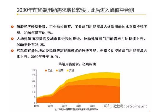 3.石油將在2030年達到峰值需求6.9億噸。交通用油也在2030年達到3.8億噸的峰值水平;其中,柴油需求逐步下滑,汽油需求在2025年前后達峰,航煤需求將保持增長。