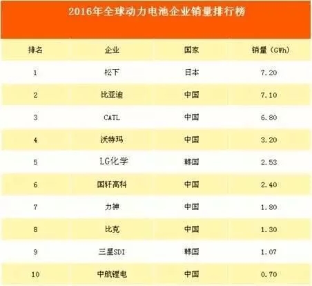 有相關(guān)統(tǒng)計(jì)數(shù)據(jù)顯示,2016年全球動(dòng)力電池企業(yè)出貨量排名中,前十排名中有七家企業(yè)來自中國(guó),依次為比亞迪、CATL、沃特瑪、國(guó)軒高科、力神、比克以及中航鋰電。萬向A123和哈光學(xué)也排在11、12位。不僅如此,即便是按照銷售額來算,中國(guó)企業(yè)共占了全球動(dòng)力電池60%的銷售額,日本企業(yè)約為17%,韓國(guó)企業(yè)約為23%。