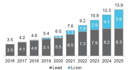 彭博新能源財(cái)經(jīng)公司分析師預(yù)計(jì),北美和歐洲兩個(gè)地區(qū)數(shù)據(jù)中心的備份電池總體需求將從2016年的3.5吉瓦時(shí)上升到2025年的14吉瓦時(shí)。在此期間,鋰離子電池市場(chǎng)份額將從1%上升至35%。