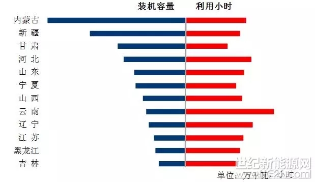 圖6 1-7月份風(fēng)電裝機較多省份風(fēng)電裝機容量和設(shè)備利用小時