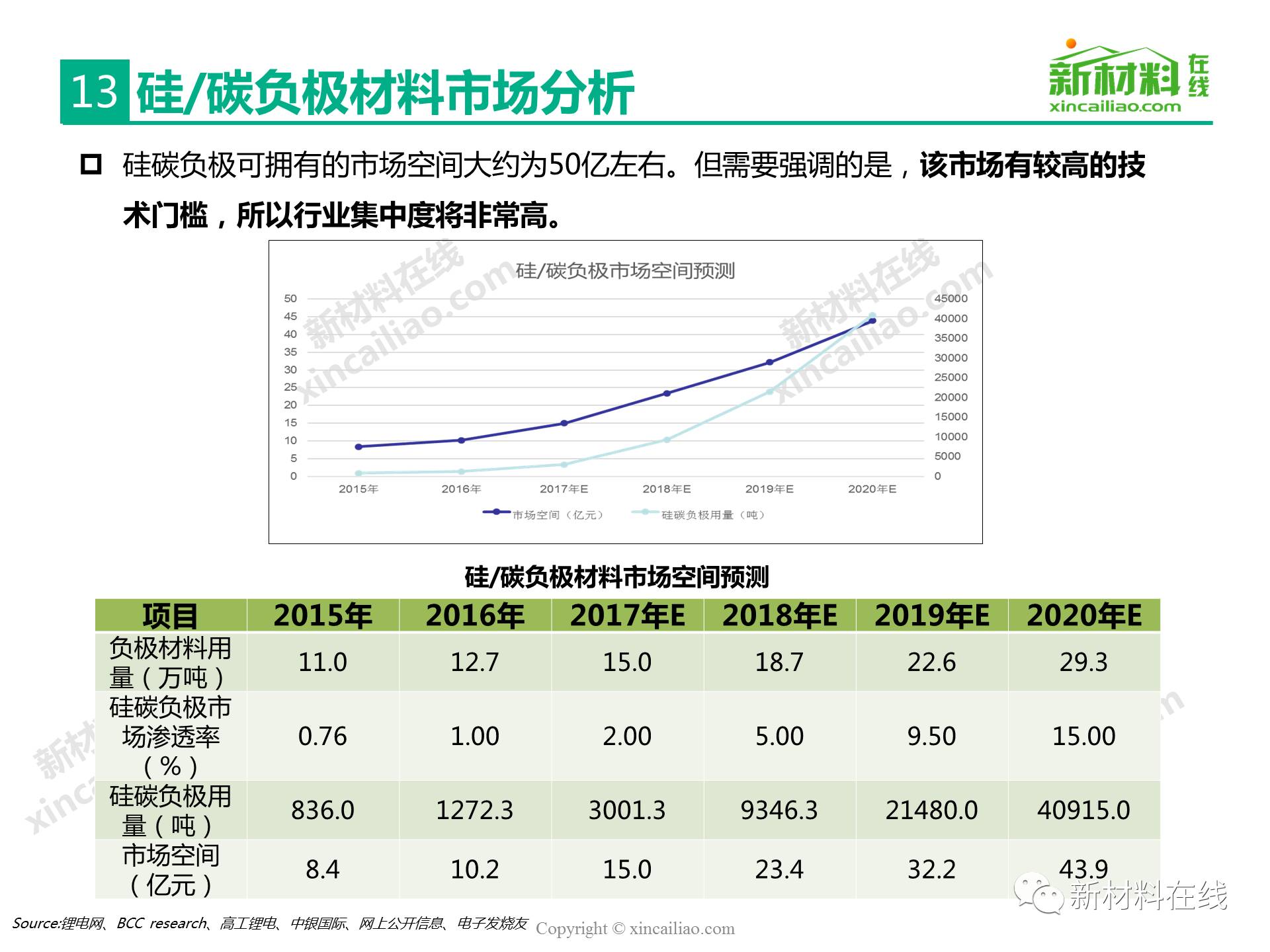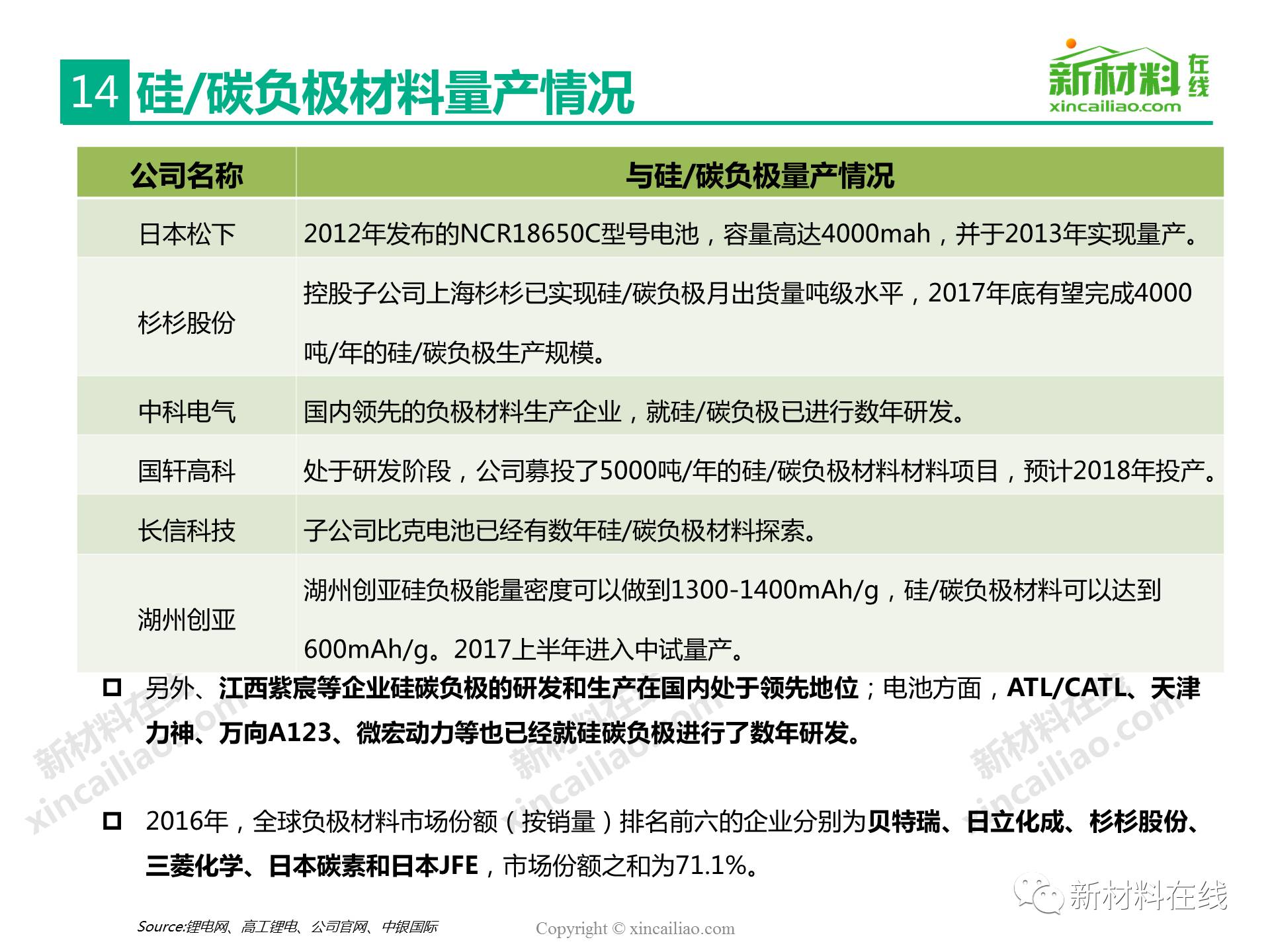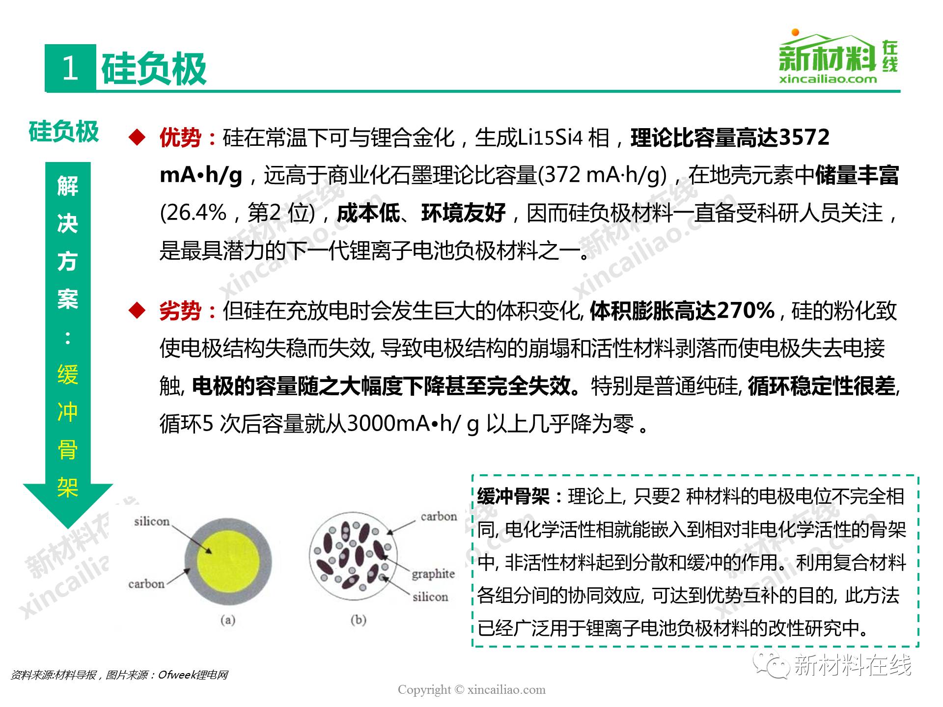 目前鋰離子電池負(fù)極材料主要包括石墨碳、硅的復(fù)合物、錫與碳的復(fù)合物、鈦氧化物、金屬鋰等,主要的性能指標(biāo)比較如表16所示,其中,硅/錫/碳、金屬鋰的比容量相對于石墨實(shí)現(xiàn)了質(zhì)的提升,將是未來高比能鋰電的新選擇,而鈦氧化物(鈦酸鋰材料)主要提高循環(huán)及快充性能。本文主要呈現(xiàn)的是2017全球硅碳負(fù)極材料研究報(bào)告。